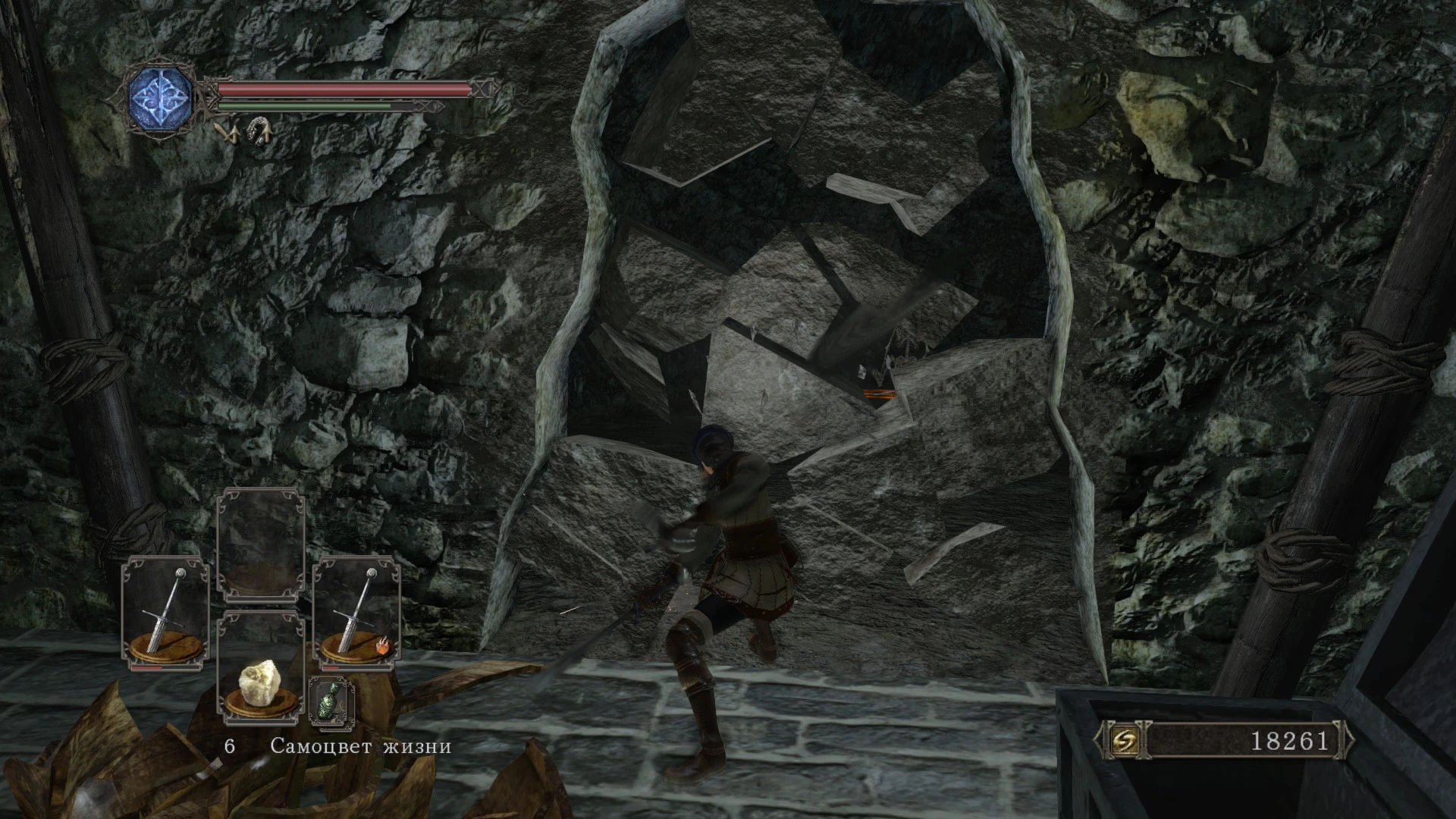 Секретный проход находится в здании с множеством ядовитых кувшинов - стену чуть правее напротив входа можно разрушить. Там же будет ящерица, с которой падает Осколок титанита и Большой осколок титанита, и несколько скелетов с сундуком.