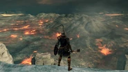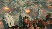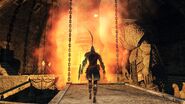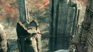 - Над третьим костром есть дверь, при попытке открыть которую появляется надпись "С этой стороны не открыть". На самом деле способа попасть туда с другой стороны нет. Чтобы открыть ее, нужно бросить огненную бомбу или черную бомбу, но остерегайтесь взрыва. Дверь останется открытой после перемещения между кострами и быстрого возвращения к костру. Дверь ведет в небольшую комнату с противником, кидавшим бомбы ранее в локации, но никаких вещей там нет. Там также есть срез через дыру в полу. Похожая механика была в начале игры, где нужно было ударить по двери, чтобы враг ее открыл или сломать стену, если ключ для нее еще не получен.