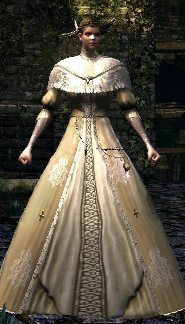 The Antiquated Set was worn by female royalty in the realm of Oolacile. The set encountered in game belongs to Dusk of Oolacile, who eventually perished in the Darkroot Basin.