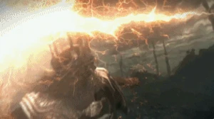 An unblockable grab attack that deals massive fire damage. It has a high horizontal hitbox, so it is possible to roll under it to avoid it. It's relatively slow and does not track well so player can simply walk backwards to avoid it. After knocking the player away, Gwyn will follow up with a jumping slash or dashing slash. It also leaves Gwyn open to attacks for a short time.