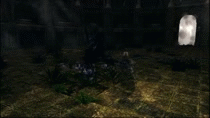 When Oolacile became threatened by the Abyss created by Manus, Artorias and his wolf companion Sif arrived there in an attempt to save Oolacile and rescue the abducted Princess Dusk.[6] However, the two were overwhelmed, and Artorias sacrificed himself to protect Sif using his Cleansing Greatshield, erecting a barrier around the young wolf.[7] Swallowed by the Dark, he became corrupted along with his already-cursed sword.[8] He was then laid to rest by the Chosen Undead after their encounter in the coliseum of Oolacile.