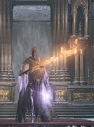 When Prince Lothric refused to link the First Flame and his kingdom fell into ruin due to various internal problems,[50] Emma, the High Priestess of Lothric, would send out messengers bearing the banner of Lothric[51] to ask allied countries for aid in resolving their internal situation. Sulyvahn would respond to his ally's call, ordering his Dancer to serve as a Boreal Outrider Knight[43] in Lothric alongside a division of Boreal Outrider Knights, under the watchful eye of Vordt of the Boreal Valley.[52] Here she positioned herself to guard the Cathedral and High Priestess Emma[53] while Vordt guarded the main gate of the city[54] and the Outrider Knights infiltrated inside and around the city of Lothric.[55]