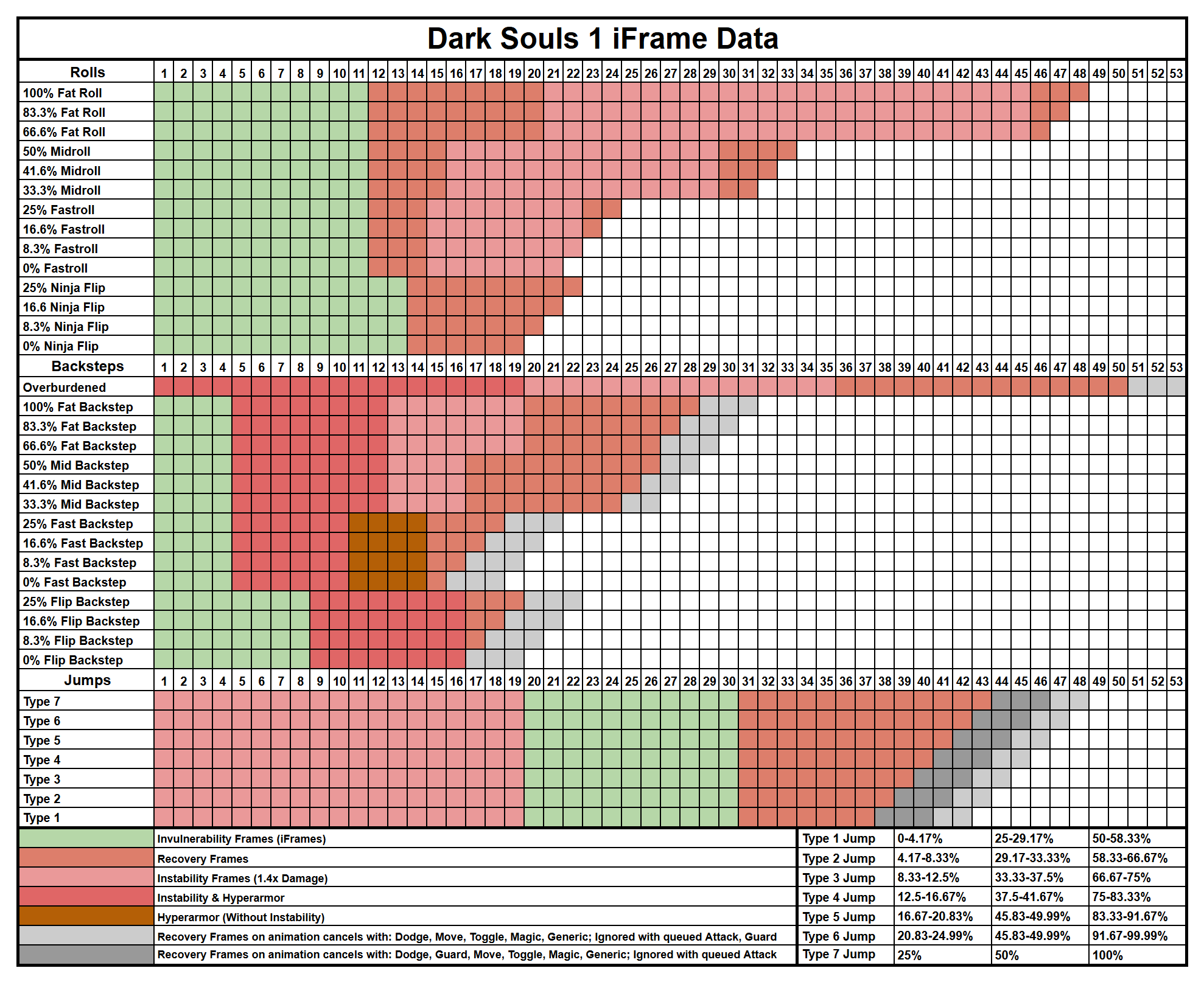| Roll Type By Equip Load | iFrames | Recovery Frames (After Iframes End) | Instability Fames (1.4x Damage Taken | Recovery Frames (End of Animation) | Total Frames in Animation |